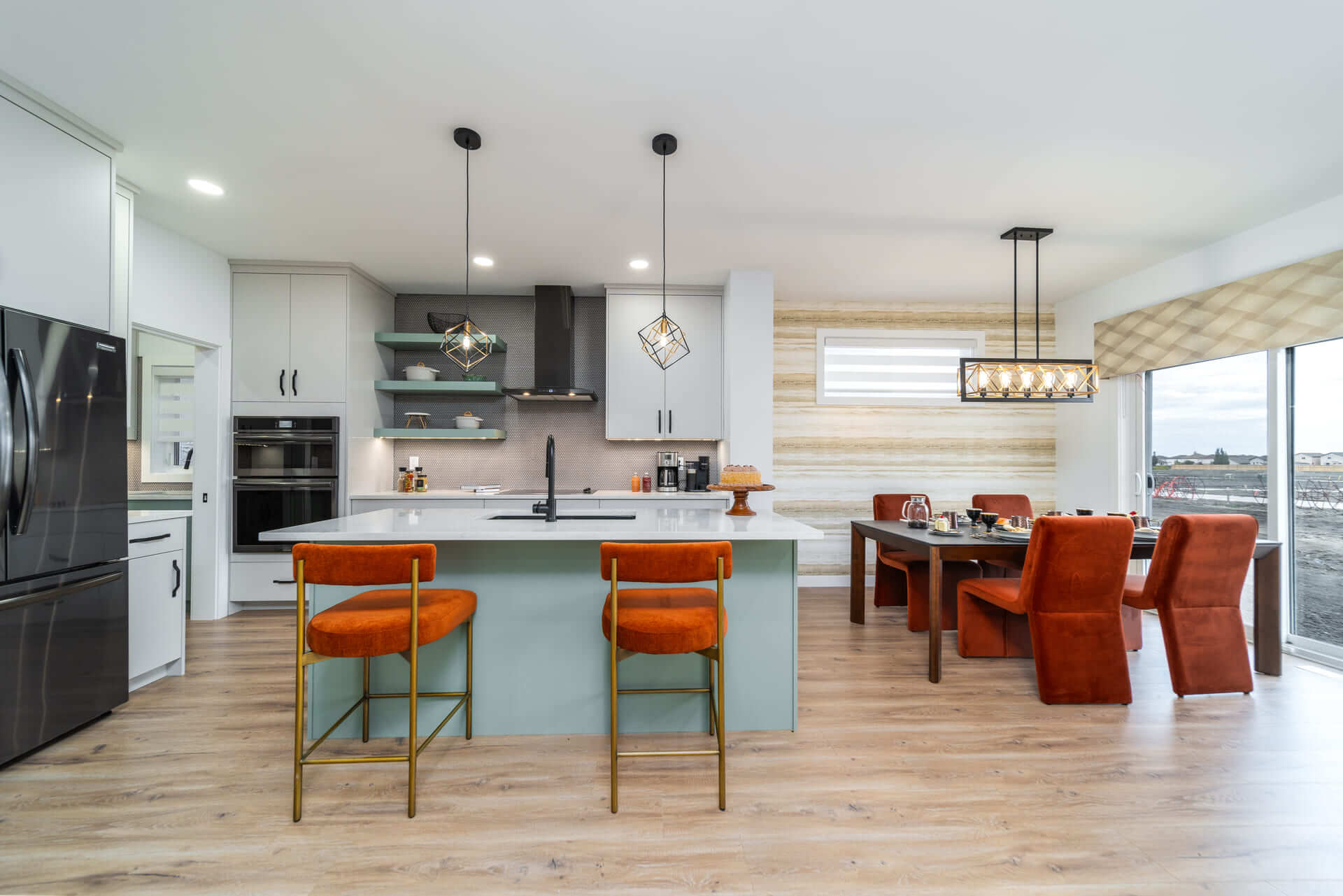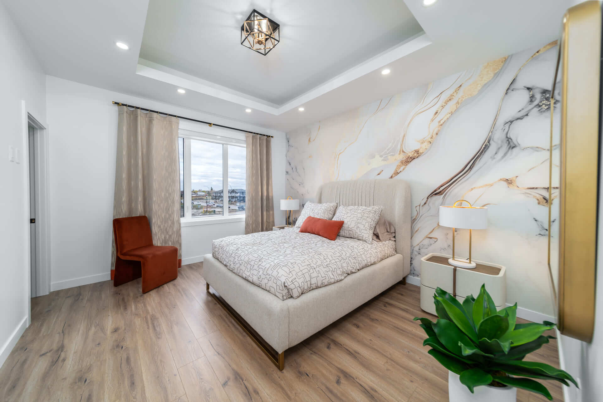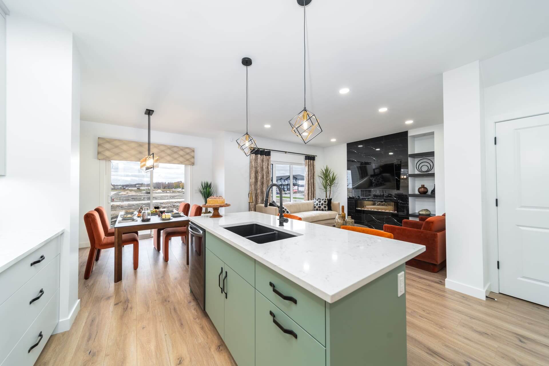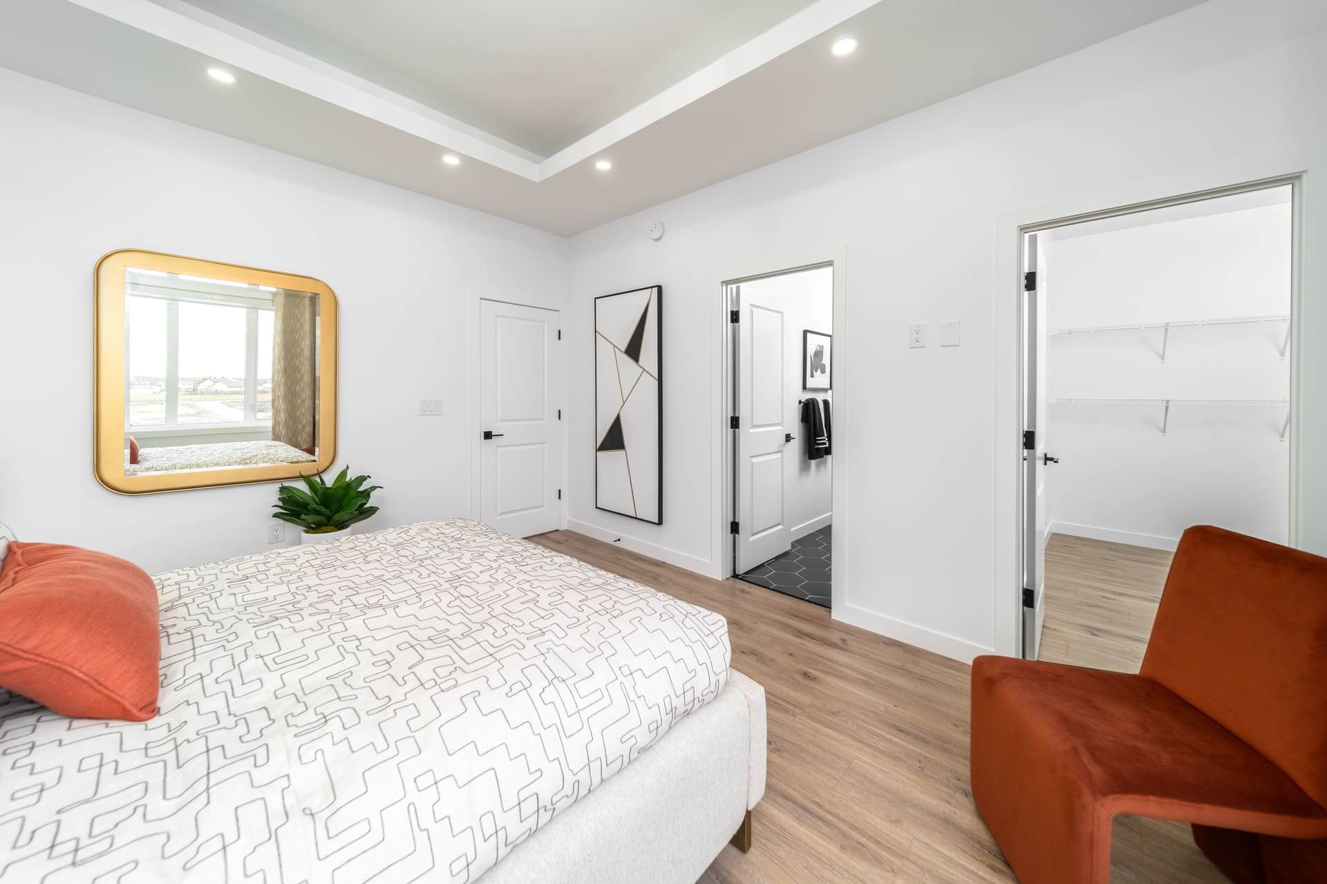 The Oakland model is a 1,915-square-foot home that blends exterior elegance with interior sophistication. It features four bedrooms, including one on the main floor and three upstairs, highlighted by a luxurious master suite with an ensuite and walk-in closet. The home offers two bathrooms and a grand entrance foyer that leads to a main kitchen equipped with an island and pantry, plus a spice kitchen for added versatility. The dining area connects seamlessly to an outdoor patio for gatherings. Upstairs, a spacious loft provides a perfect relaxation space. Customization options include a deluxe ensuite, second-floor laundry, a mudroom, and a cantilevered entertainment center. Standard features include nine-foot main floor ceilings, LED lighting, and Decora switches. The basement has a separate entrance, adding flexibility for a private suite or recreation area. This model offers modern luxury and functional living for any lifestyle.