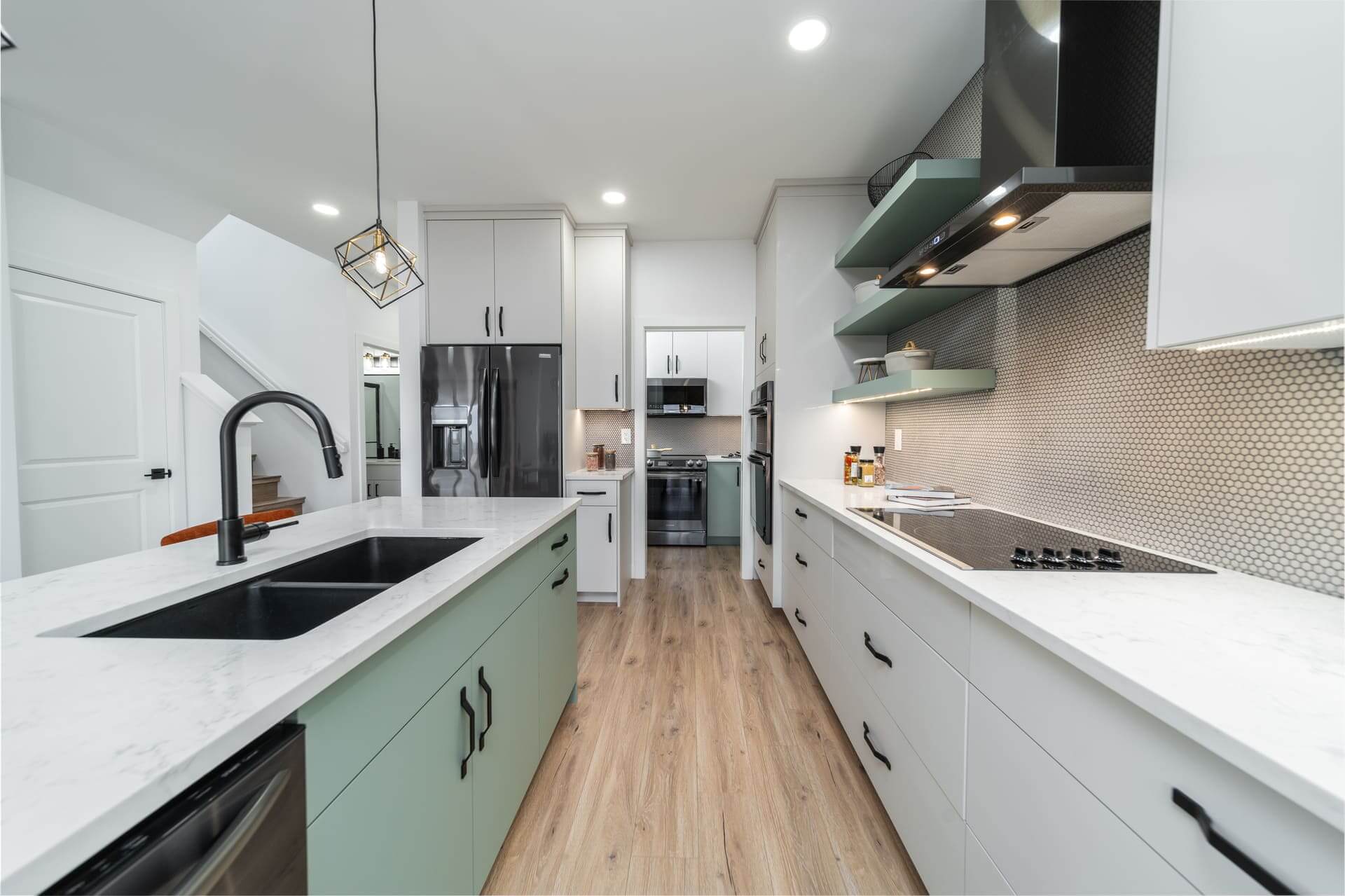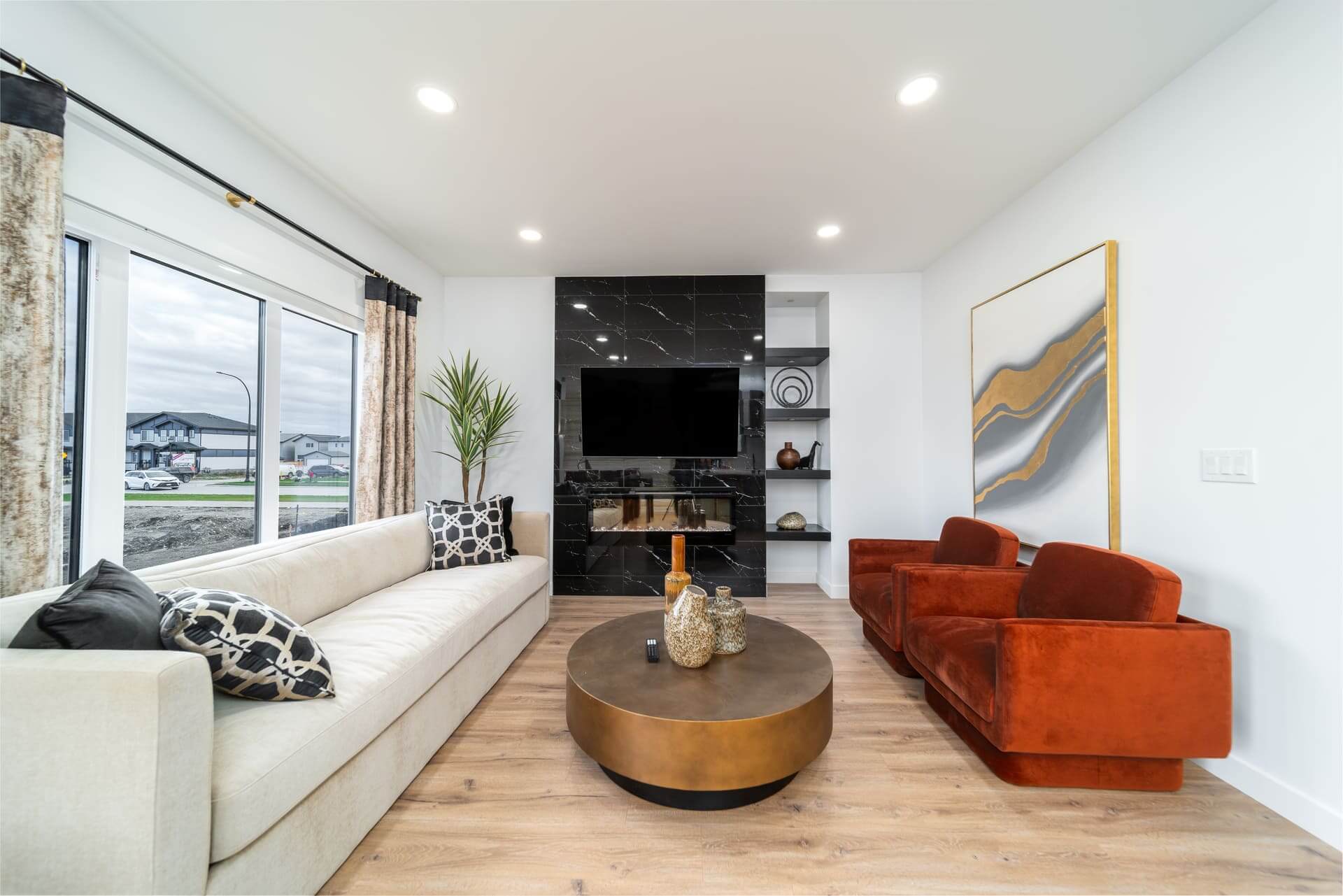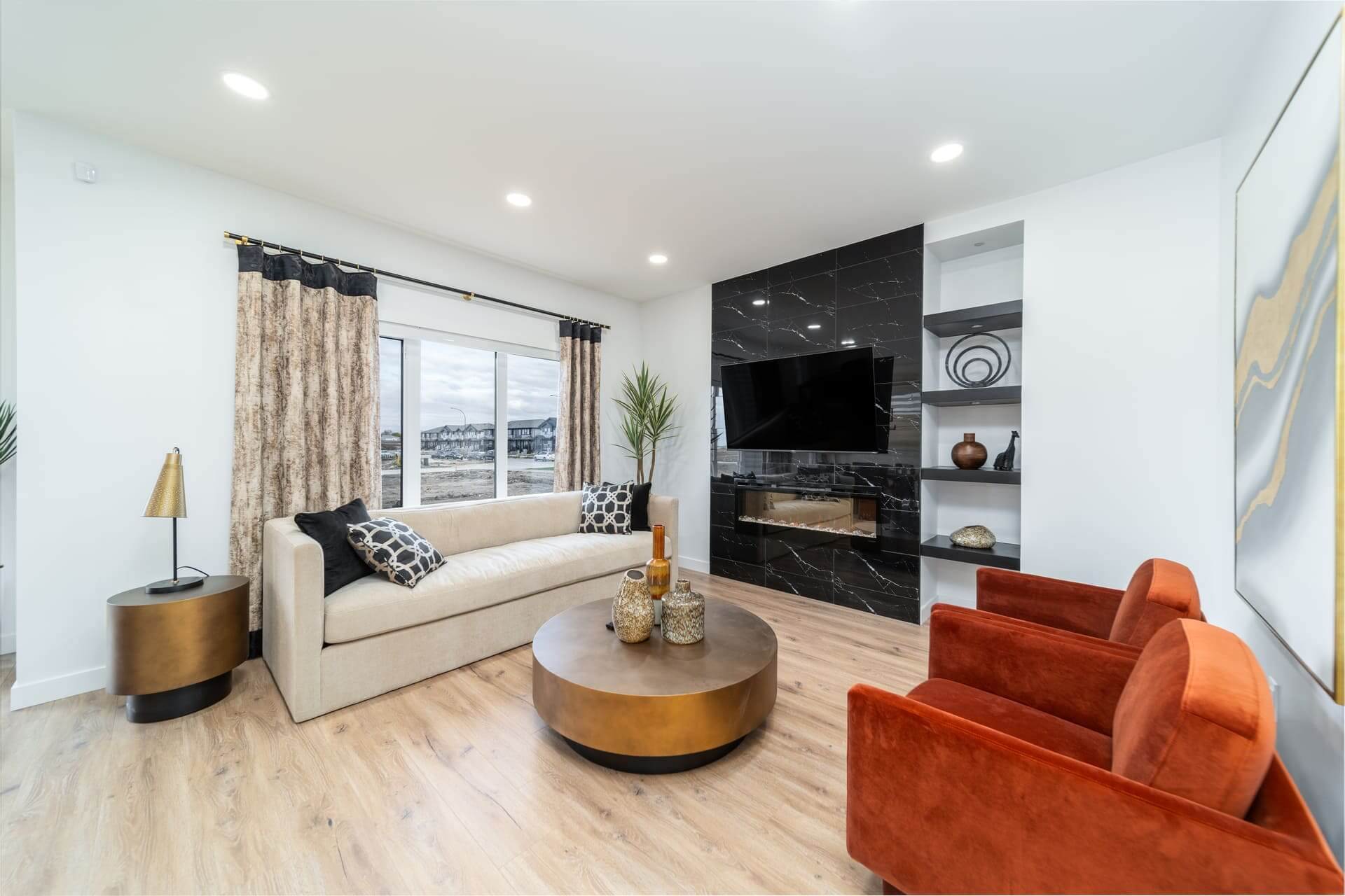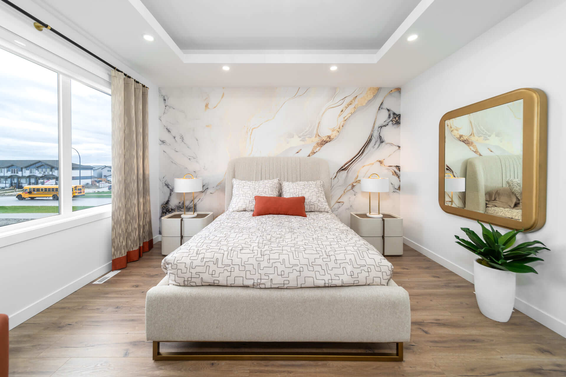 The Oakland model is a 1,915-square-foot home that blends exterior elegance with interior sophistication. It features four bedrooms, including one on the main floor and three upstairs, highlighted by a luxurious master suite with an ensuite and walk-in closet. The home offers two bathrooms and a grand entrance foyer that leads to a main kitchen equipped with an island and pantry, plus a spice kitchen for added versatility. The dining area connects seamlessly to an outdoor patio for gatherings. Upstairs, a spacious loft provides a perfect relaxation space. Customization options include a deluxe ensuite, second-floor laundry, a mudroom, and a cantilevered entertainment center. Standard features include nine-foot main floor ceilings, LED lighting, and Decora switches. The basement has a separate entrance, adding flexibility for a private suite or recreation area. This model offers modern luxury and functional living for any lifestyle.